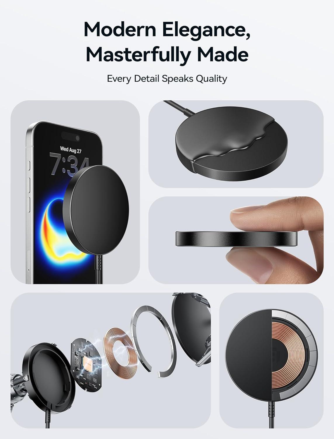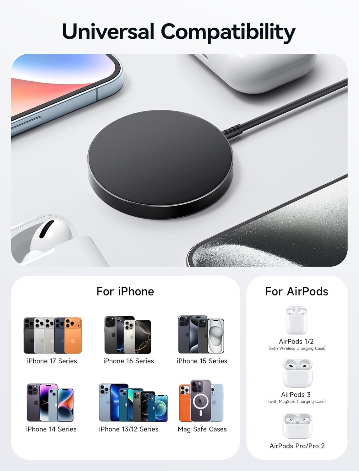 Compatible with iPhone 17/16/15/14/13/12: JSAUX magnetic wireless charger provides fast and efficient wireless charging for your devices. Compatible with iPhone 17, iPhone Air, iPhone 17 Pro, iPhone 17 Pro Max, iPhone 16, iPhone 16e, iPhone 16 Pro, iPhone 16 Plus, iPhone 16 Pro Max, iPhone 15, iPhone 15 Pro, iPhone 15 Plus, iPhone 15 Pro Max, iPhone 14, iPhone 14 Pro, iPhone 14 Plus, iPhone 14 Pro Max,iPhone 13, iPhone 13 Pro, iPhone 13 Pro Max, iPhone 13 mini, iPhone 12, It also supports charging compatible with AirPods 3, AirPods 2, AirPods Pro, and MagSafe Charger-adapted official case