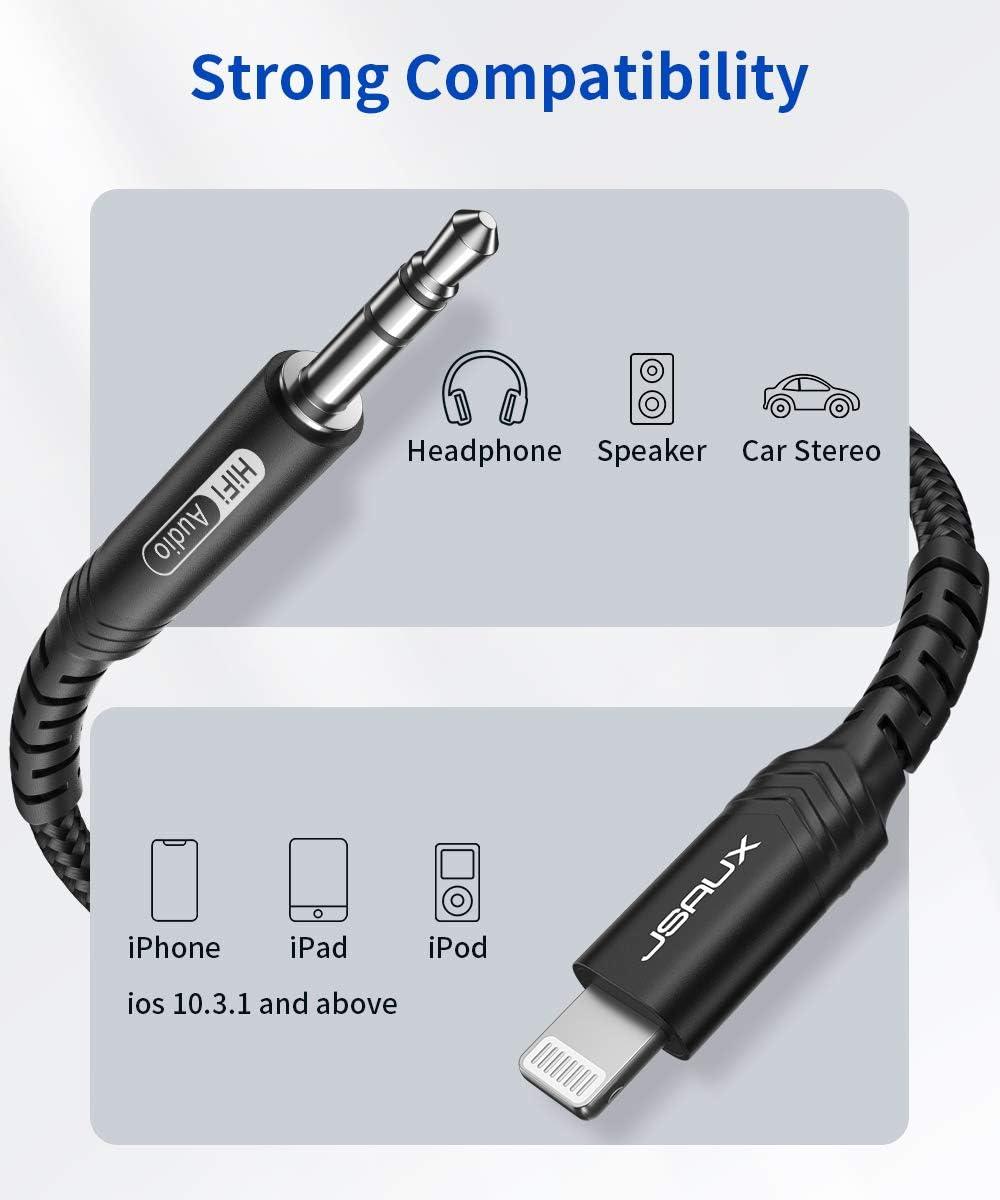 【Compatibility List】: JSAUX Lightning to 3.5mm Car Audio Cable compatible with most of the APPLE devices: iPhone 14 / 14 Plus / 14 Pro / 14 Pro Max /iPhone 13 / 13mini / 13 Pro / 13 Pro Max / 12 / 12 mini / 12 Pro / 12 Pro Max / 11 / 11 mini / 11 Pro / 11 Pro Max / XS / XS Max / XR / X / 8 / 8 Plus / 7 / 7 Plus, iPod touches 6th Generation, iPad Mini / iPad Air / iPad Pro. (NOTE: Doesn't compatible with Airpods Max, Beats Solo Pro, 2018 iPad Pro 12.9″ , iPad Pro 11″, and iPad air 2020 gen4)