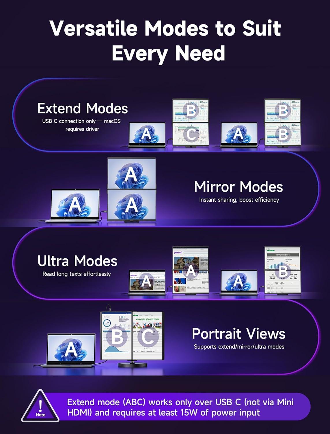 【Triple Display- Extended(ABC) Mode】Utilize the Extended(ABC) mode to extend your workspace across three screens, offering flexibility for multitasking and enhancing productivity. Whether for financial analysis, or creative projects, this mode provides expanded screen real estate tailored to diverse needs[macOS does not support extended mode (ABC)]