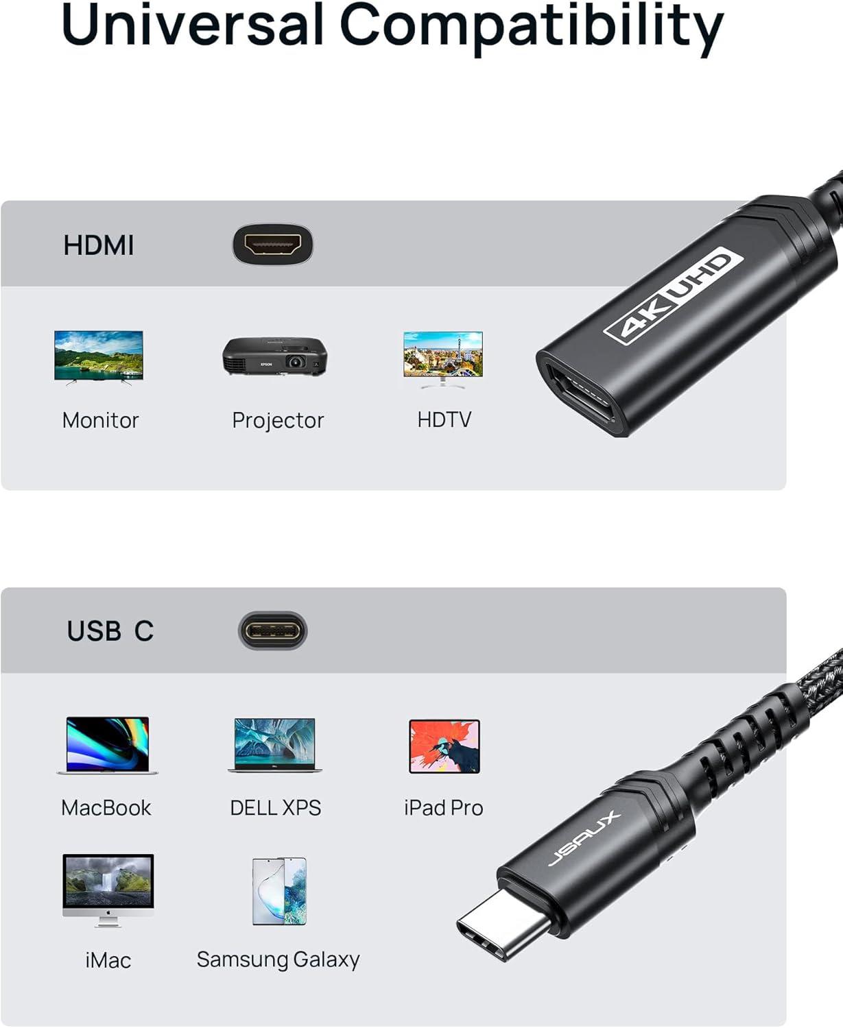 【USB C to 4K HDMI Adapter】Offering 4K resolutions up to 3840×2160 at 30Hz. JSAUX USB C to HDMI Adapter delivers a clean, vivid, seamless videos.Only USB C to HDMI [Non-bidirectional]