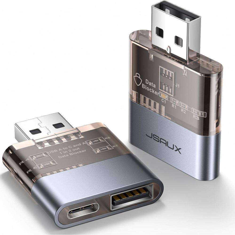 JSAUX USB Data Blocker(2-Pack), Transparent 2-in-1 USB A Male to USB A & USB C Female Data Blocker Only for Charge, Protect Against Juice Jacking, Refuse Hacking Provide Safe Charging(Grey)