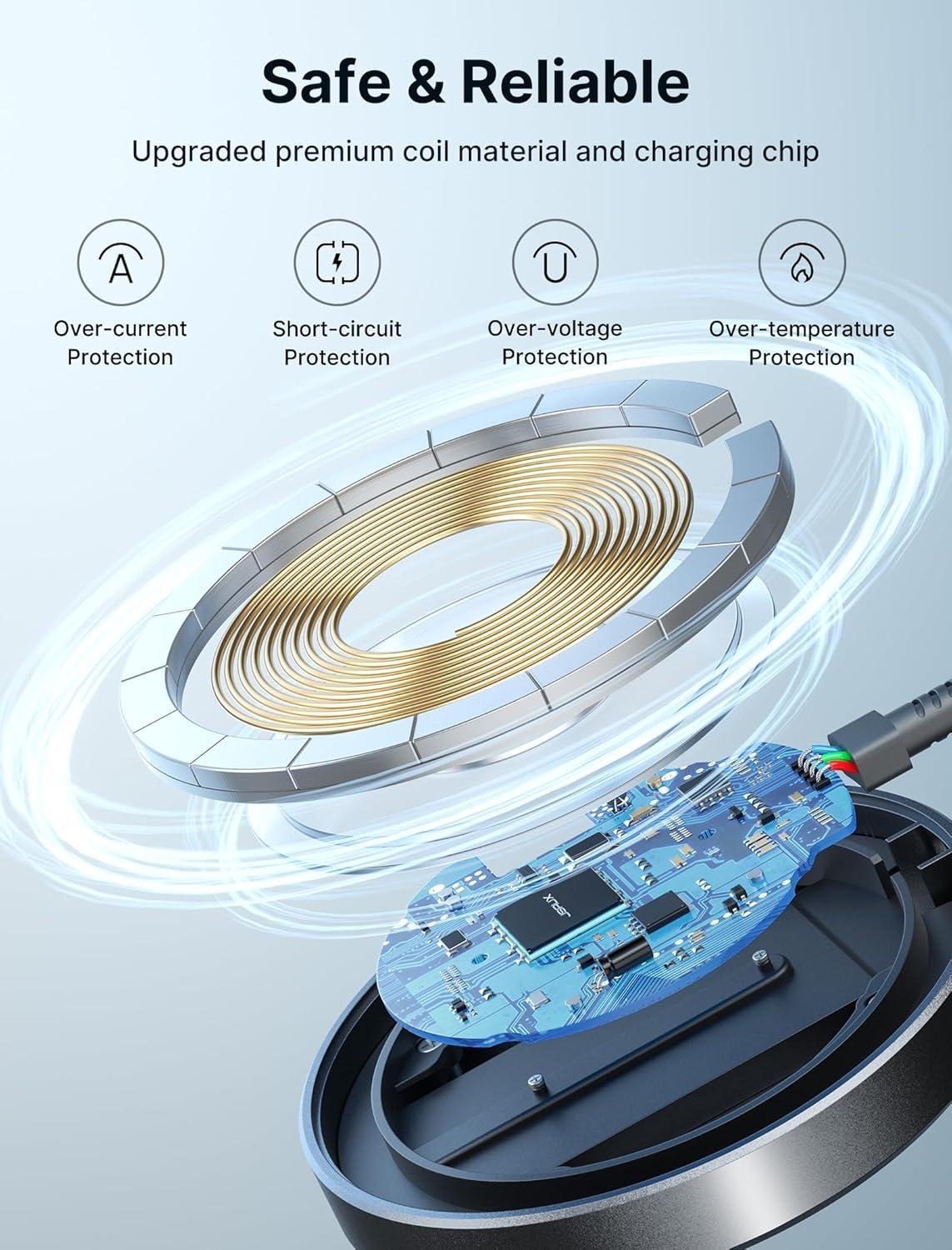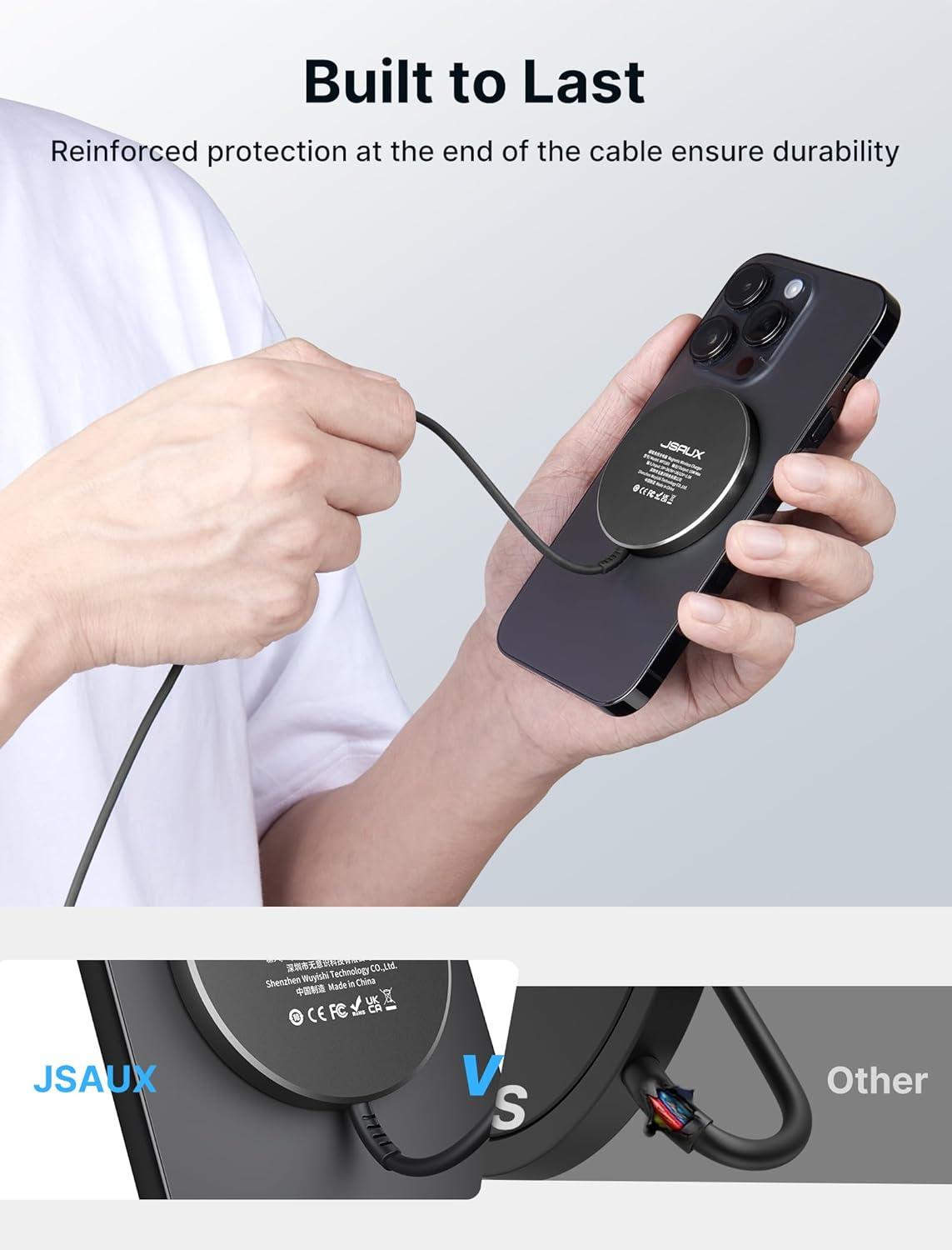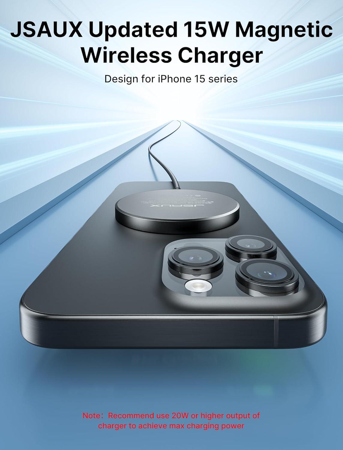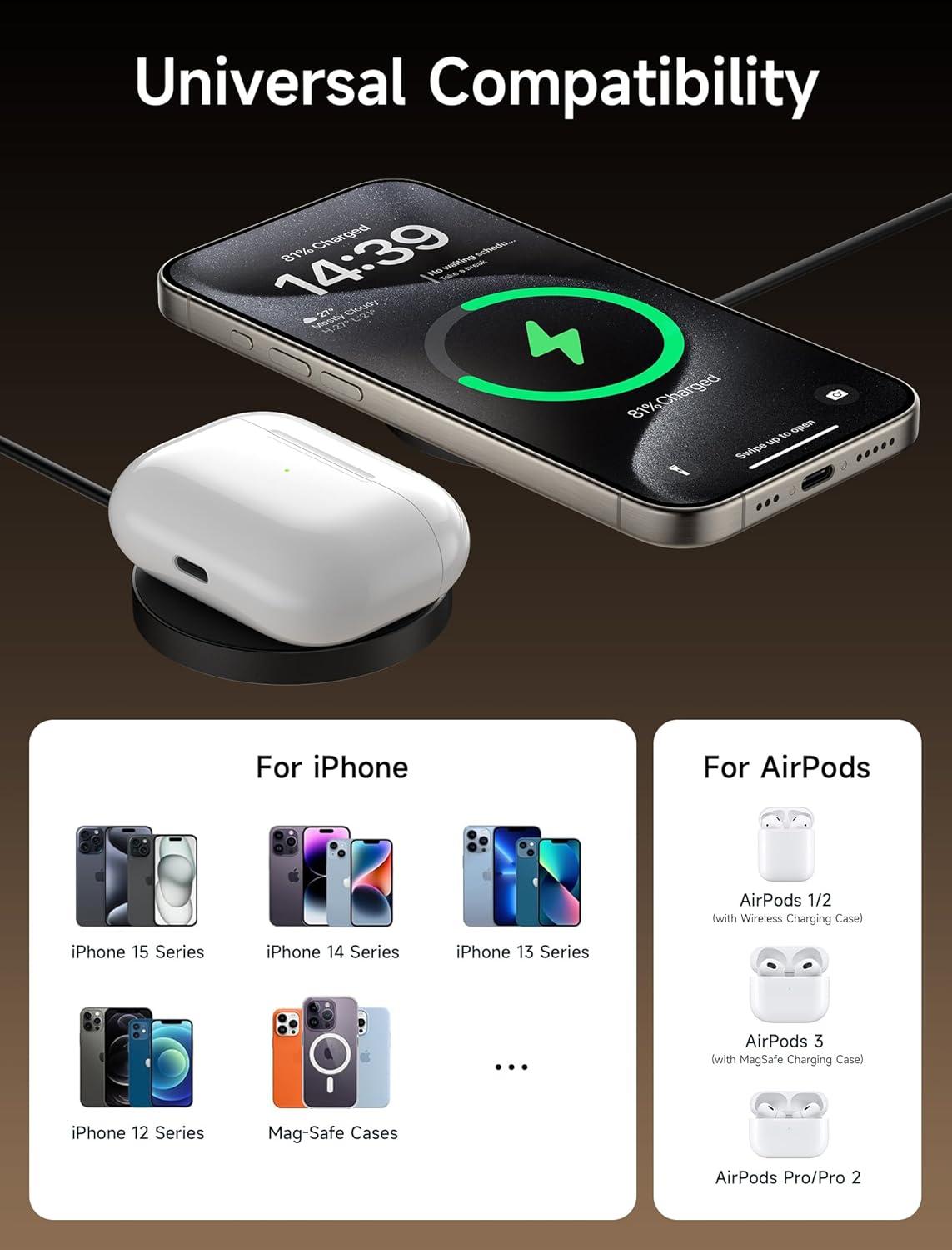 Compatible with iPhone 17/16/15/14/13/12: JSAUX magnetic wireless charger provides fast and efficient wireless charging for your devices. Compatible with iPhone 17, iPhone 17 Air, iPhone 17 Pro, iPhone 17 Pro Max, iPhone 16, iPhone 16e, iPhone 16 Pro, iPhone 16 Plus, iPhone 16 Pro Max, iPhone 15, iPhone 15 Pro, iPhone 15 Plus, iPhone 15 Pro Max, iPhone 14, iPhone 14 Pro, iPhone 14 Plus, iPhone 14 Pro Max,iPhone 13, iPhone 13 Pro, iPhone 13 Pro Max, iPhone 13 mini, iPhone 12. It also supports charging compatible with Airods 3, AirPods 2, AirPods Pro, and MagSafe Charger-adapted official case.