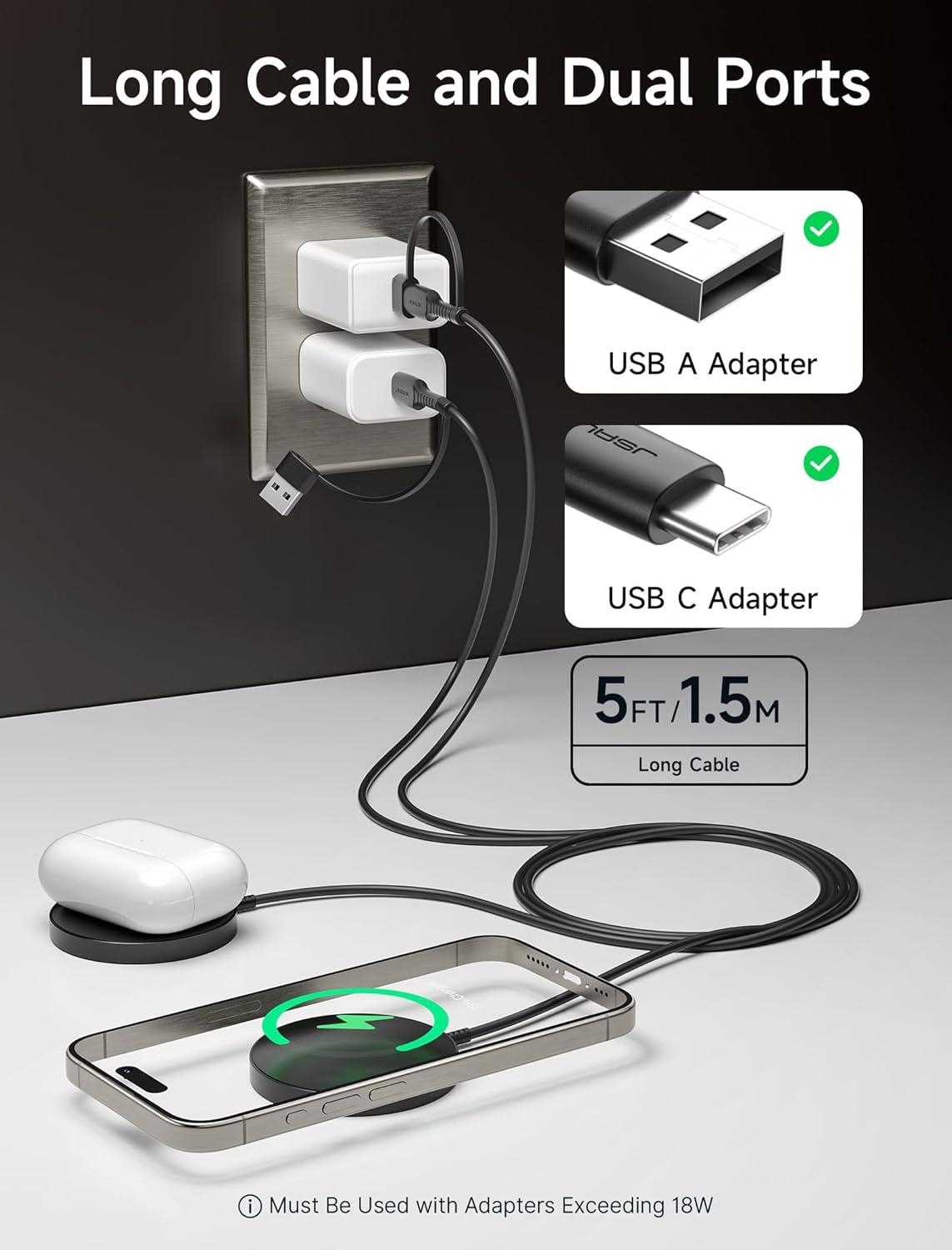 Portable & Multi-port Input: The high-quality metal material offers good performance with longer spanlife. Only 0.23 inch (thickness), with 4.9 ft integrated multi-port cable, just like the smallest & lightest wireless mag safe charger. Free up more space and easy to carry. Recommended to use with 18W, 20W or higher USB C & USB A Power Adapter (SOLD SEPARATELY)