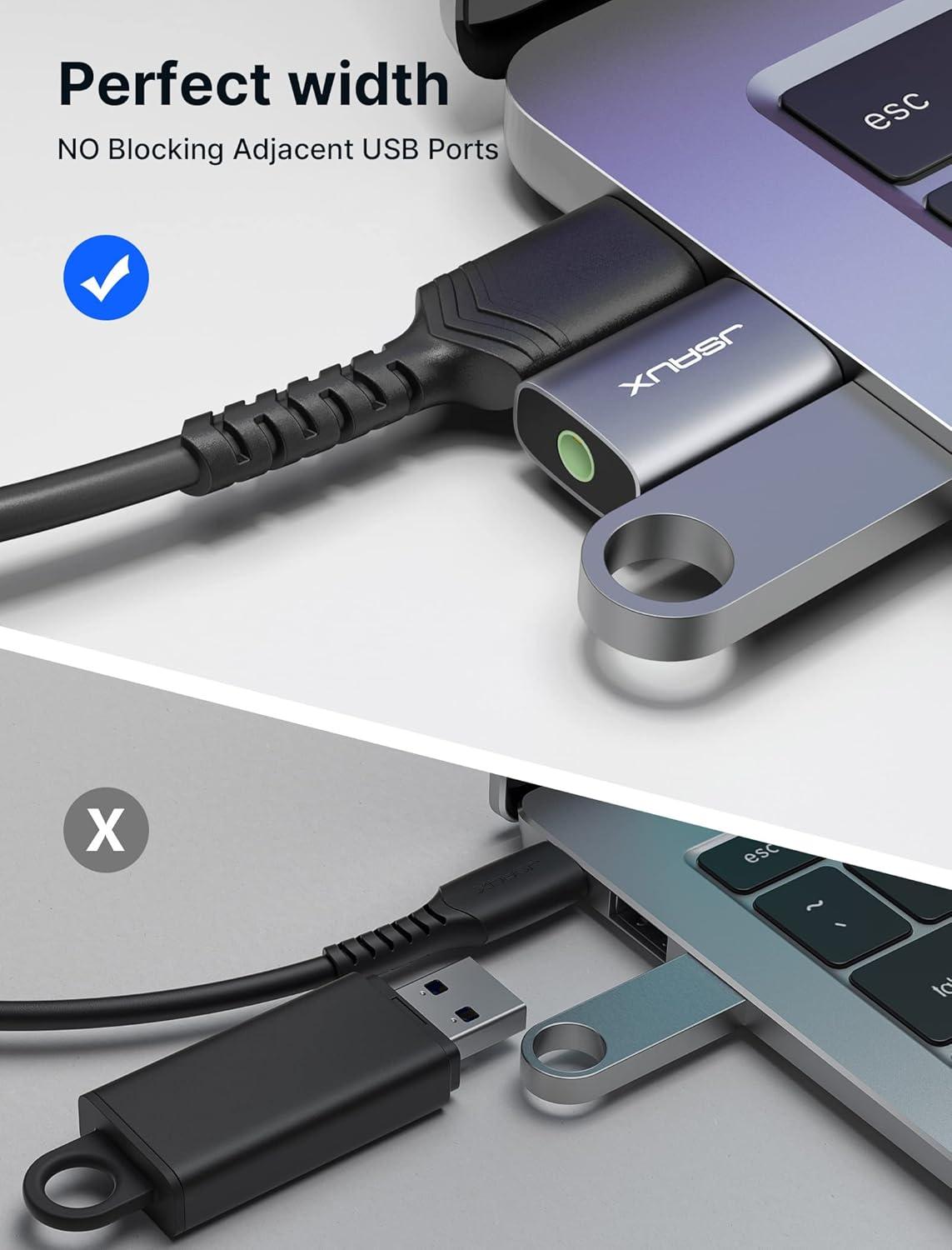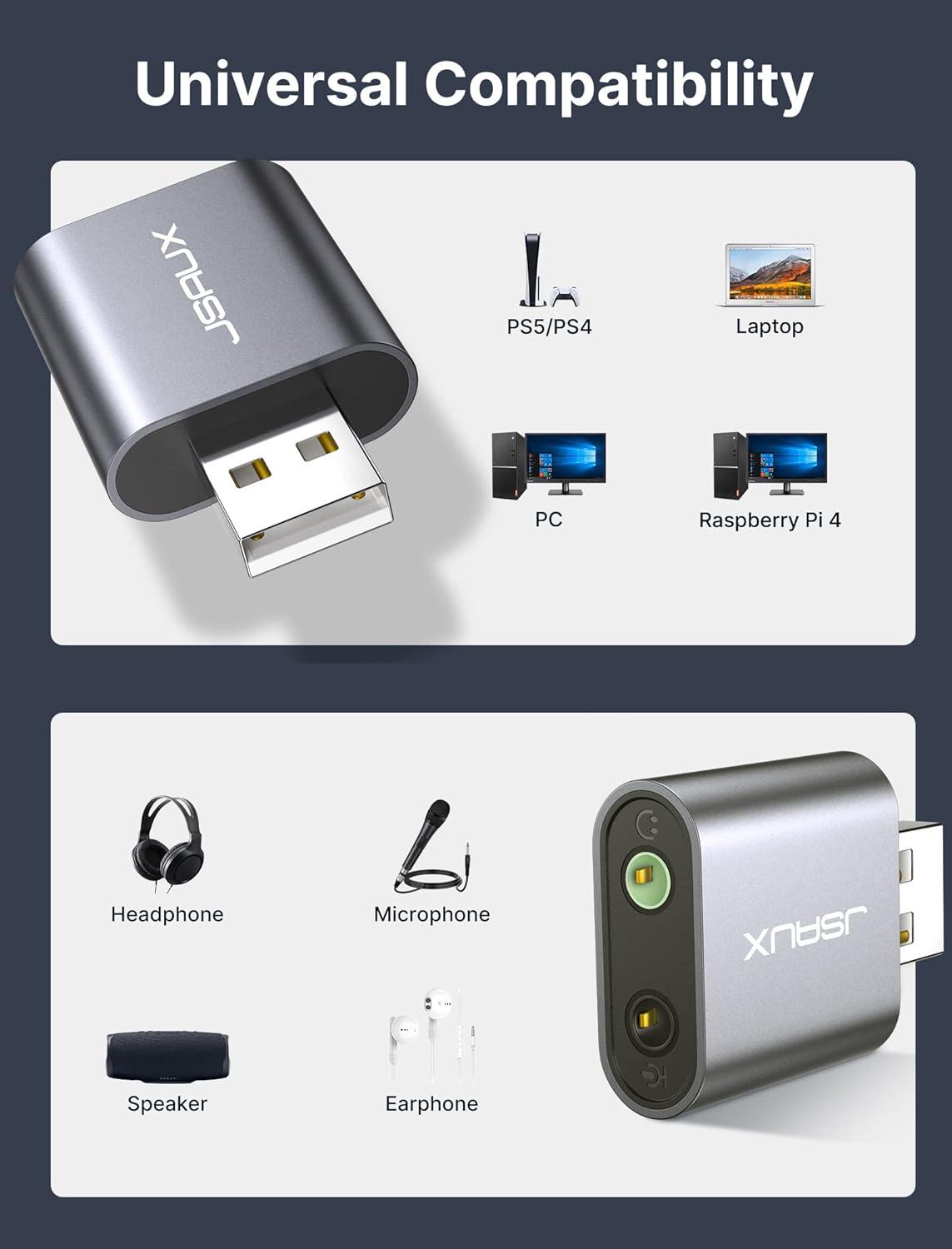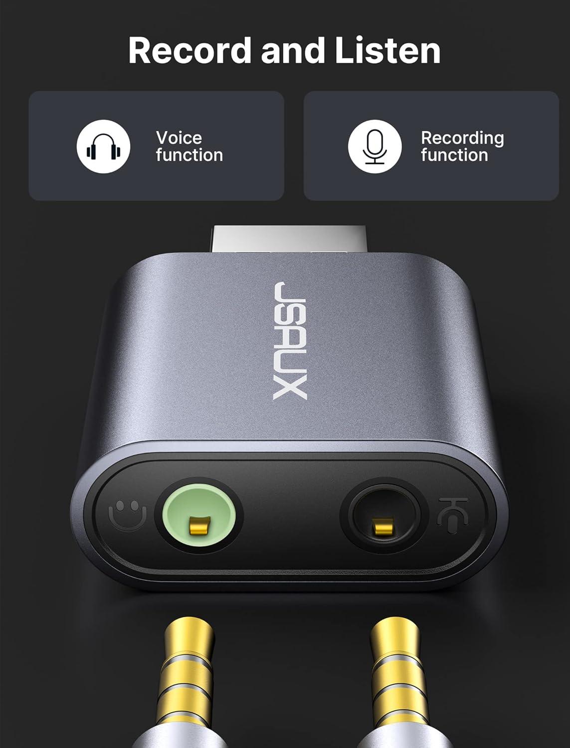 【2 in 1 Essential】JSAUX External Sound Card supports listening + speaking, dual functions. Adds a mono microphone-in and a stereo audio-out port to your computer through a USB port, enables you to connect your existing headphones, headset, speakers, or microphone with TRS 3.5mm jack to your PC, laptop, through a USB interface
