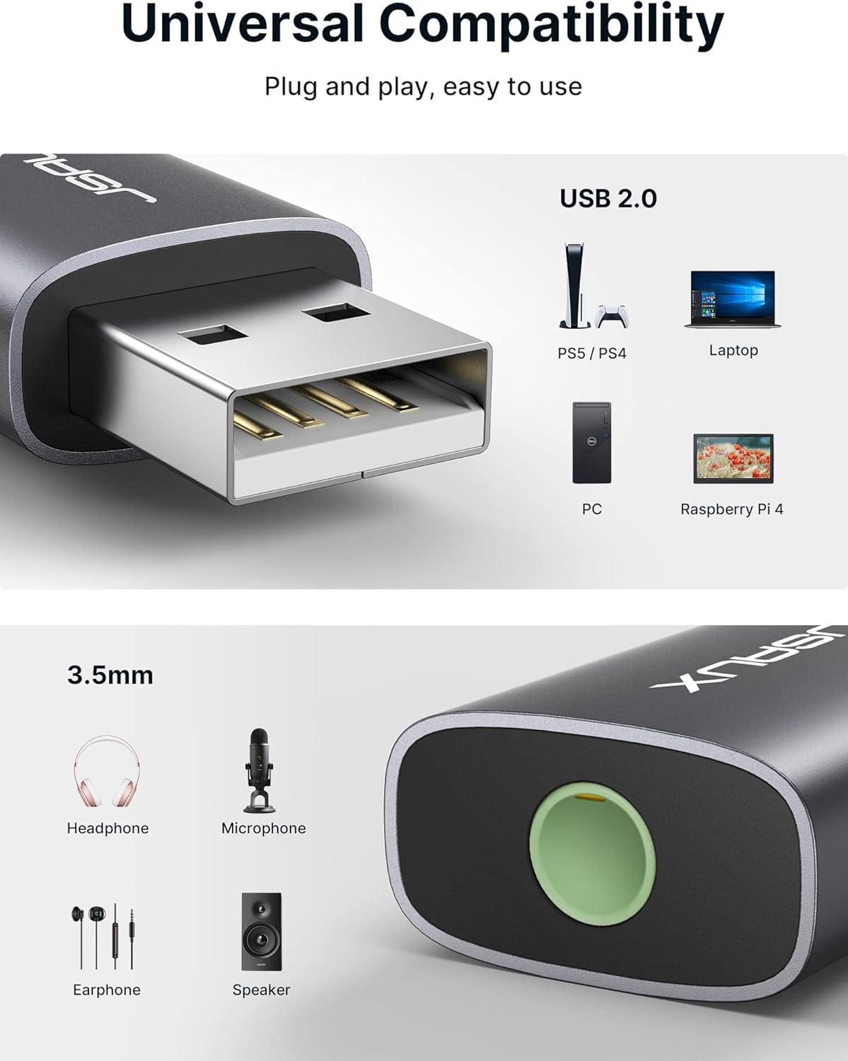 【Wide Compatibility】The External USB Sound Card for Windows, Linux, Mac, Raspberry pi, PlayStation PS5, PS4, PC, Laptop, Speaker, external TRS Microphone, headphone, earphone, and more. Please note it only supports mono microphone TRS, it does not support TS, TRRS. Not compatible with PS3 and car